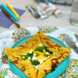 - Tavada biraz tereyağı eritin, kreplerden birini tavaya geri koyun, kenarlarını katlayın, ortasına 1 yumurta kırın ve üzerine ıspanağı ve ufaladığınız Sütdiyarı Beyaz Peyniri ekleyin.